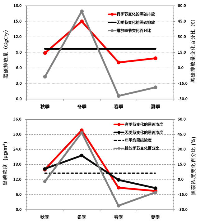1黑碳排放的季节变化(红色实线)和年平均黑碳排放(黑色实线),每个季节的黑碳排放量相较于年平均排放水平的百分比,计算公式如下:黑碳排放季节变化百分比=(每个季节的黑碳排放-年平均黑碳排放)/年平均黑碳排放*100%(灰色实线)(上图);模式中考虑(红色实线)和不考虑(黑色实线)黑碳排放季节所计算的黑碳浓度的季节变化,黑色虚线为不考虑黑碳排放季节变化后,计算的年平均黑碳浓度水平线,灰色实线为黑碳浓度变化百分比,计算公式如下:(考虑黑碳排放的季节变化所计算的黑碳浓度-不考虑排放季节变化所计算的黑碳浓度)/不考虑排放季节变化所计算的黑碳浓度*100%