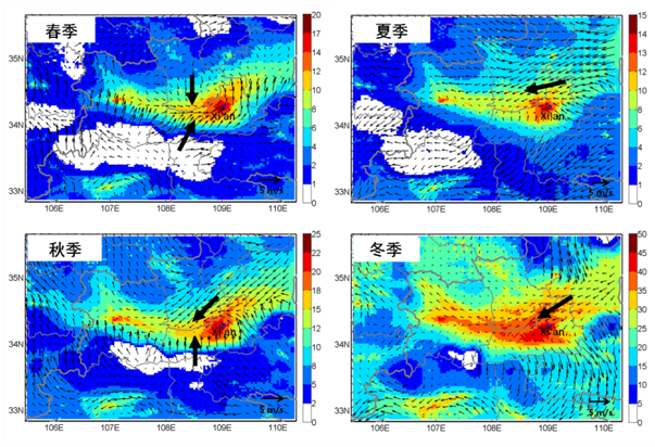 2不同季节关中地区黑碳浓度(μg/m3)和水平风场的空间分布